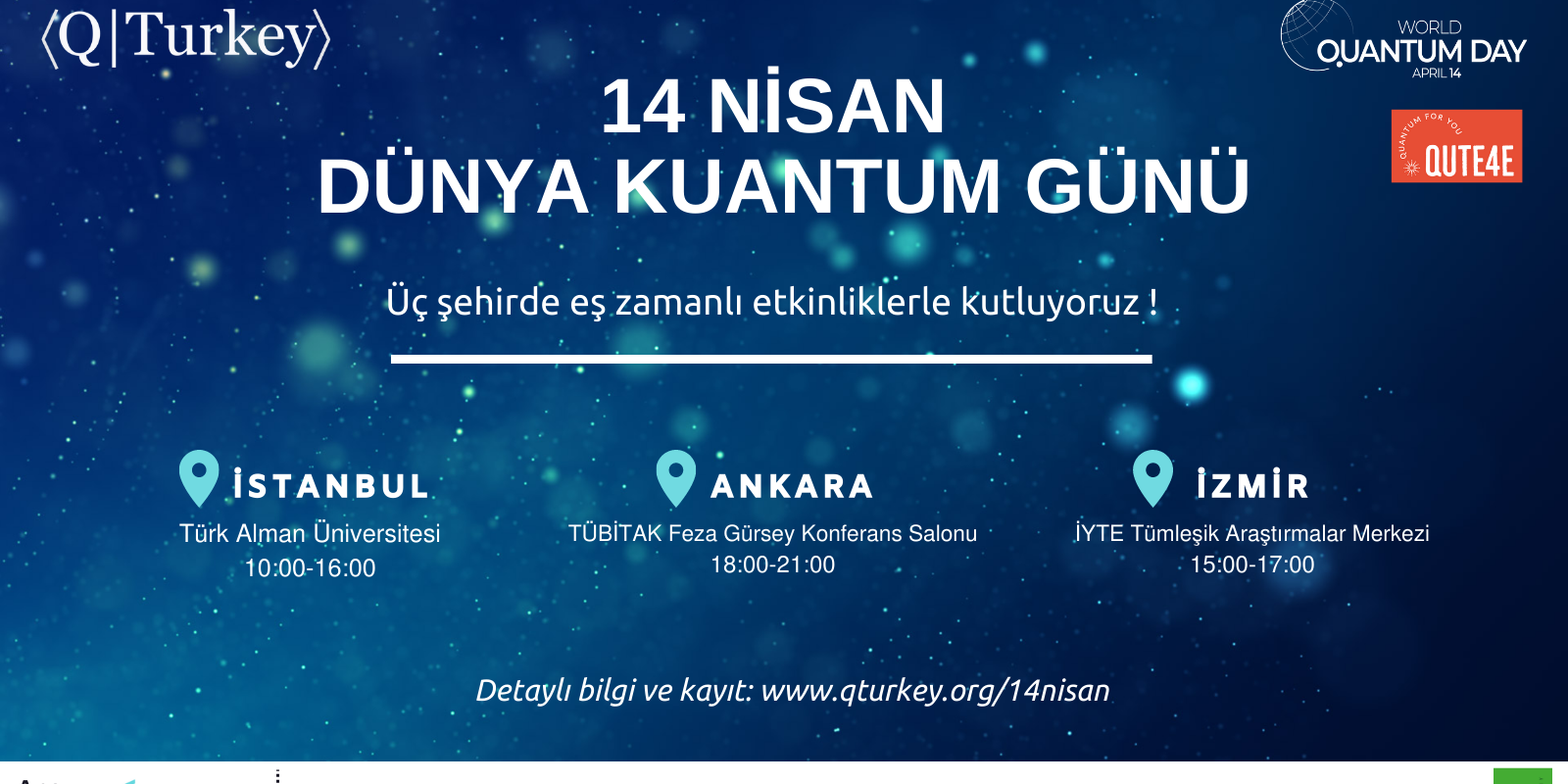 Biz de QTurkey olarak bu yıl 14 Nisan Dünya Kuantum Günü’nü İstanbul, Ankara ve İzmir’de gerçekleştireceğimiz etkinliklerle kutluyoruz.